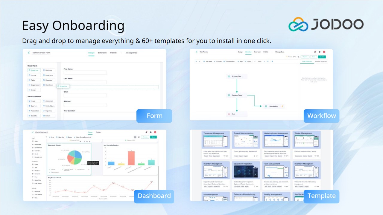Unlock real-time, data-driven insights with fully customizable dashboards, or accelerate deployment using a rich library of ready-to-use templates. Jodoo empowers organizations to streamline processes, enhance productivity, and drive digital transformation—all within one intelligent platform.
